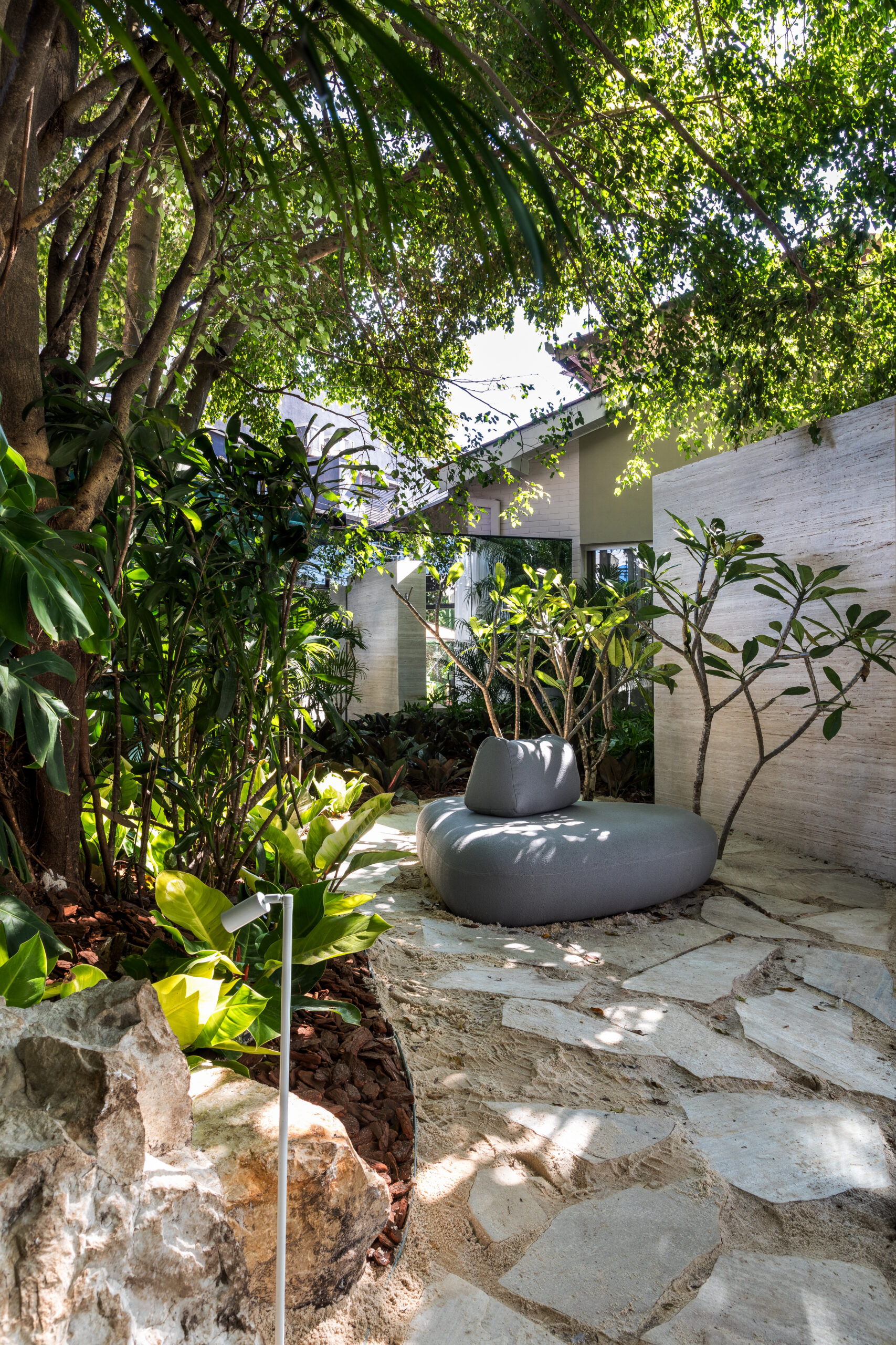 Outro elemento de destaque são as paredes em pedra e a vegetação que circunda todo o espaço, criando uma proteção para quem está no interior, ao mesmo tempo que permite a valorização do verde no exterior. “O loft funciona quase como uma obra viva, que derrama sua trama pelo espaço formando desenhos que mudam conforme a luminosidade”, finalizam os profissionais.