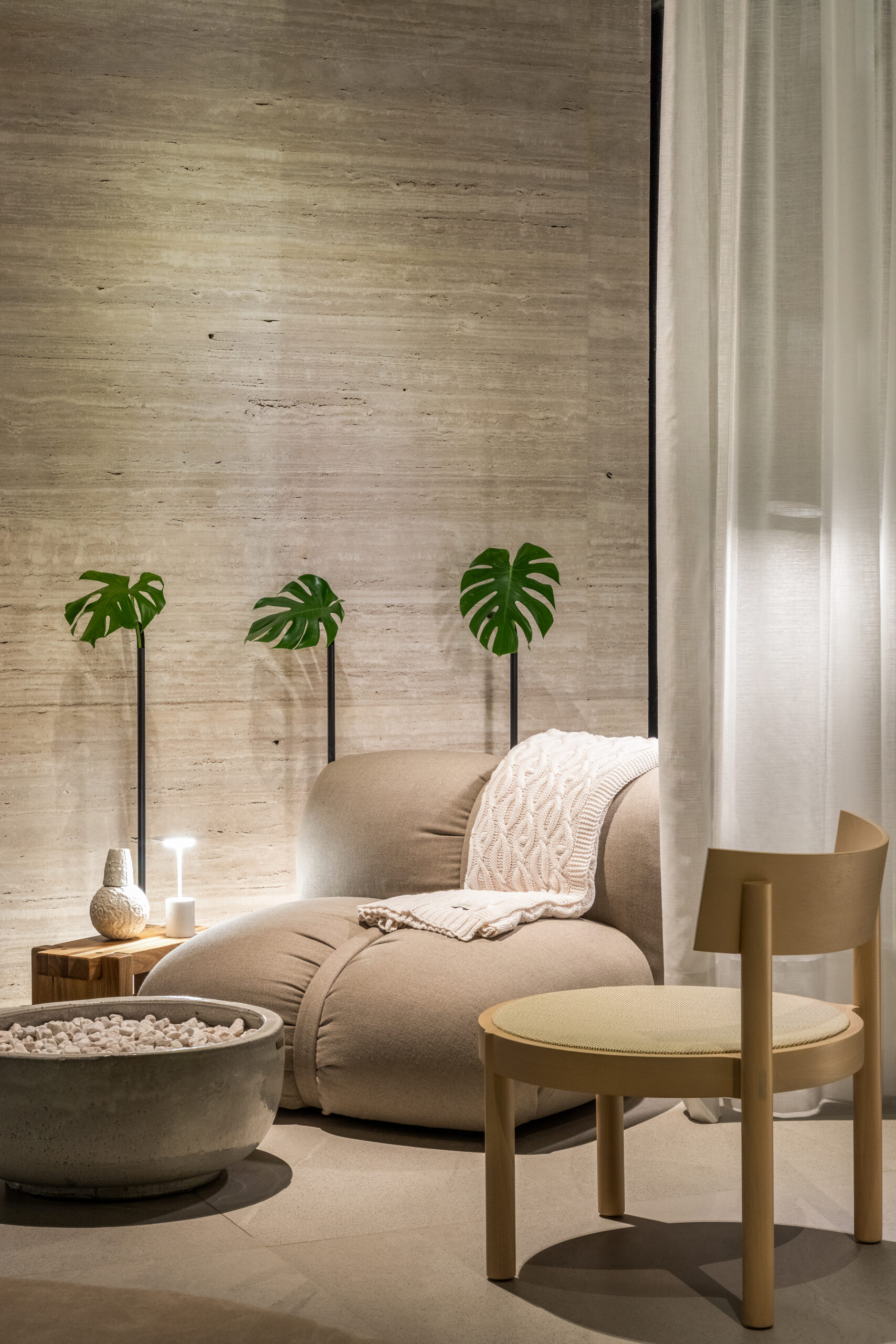 Para explorar os sentidos, as profissionais apostaram em materiais como mármore travertino extra, estrutura metálica preta e vidro extra clear, e mobiliário Momenttum com design 100% nacional. Entre as escolhas estão o banco Mucki, criado por Sérgio Rodrigues em 1958 e reeditado em 2005, e o banco Jake, assinado por Fernando Mendes. Destaque, ainda, para as peças de Guilherme Wentz, como a poltrona e o puff Fita. Casual e inspirada no improviso, a série Fita é feita com espumas de diferentes densidades cobertas por tecidos que representam um novo caminho têxtil da marca ao utilizar fibras naturais e sustentáveis a técnicas tradicionais de tecelagem.